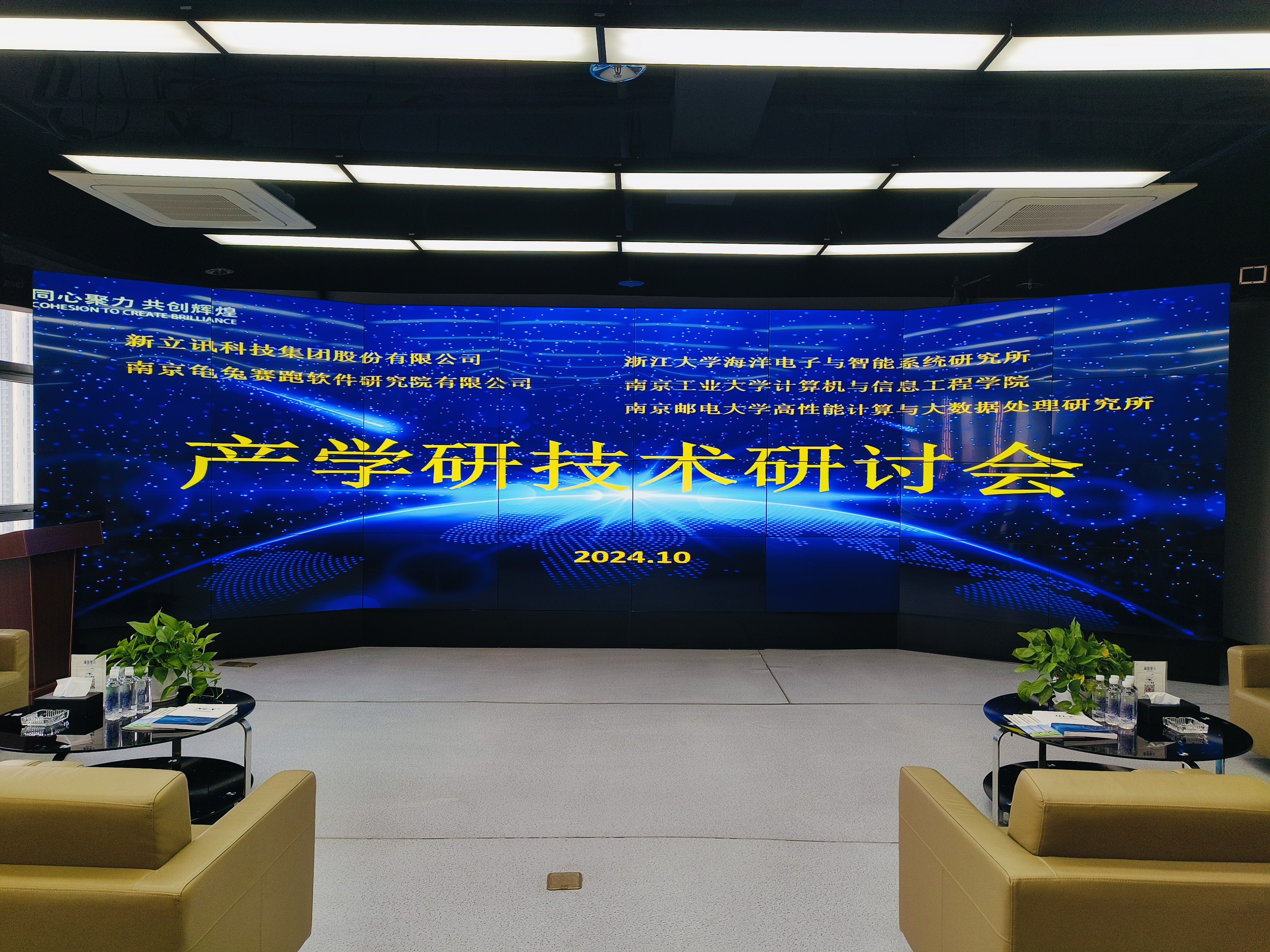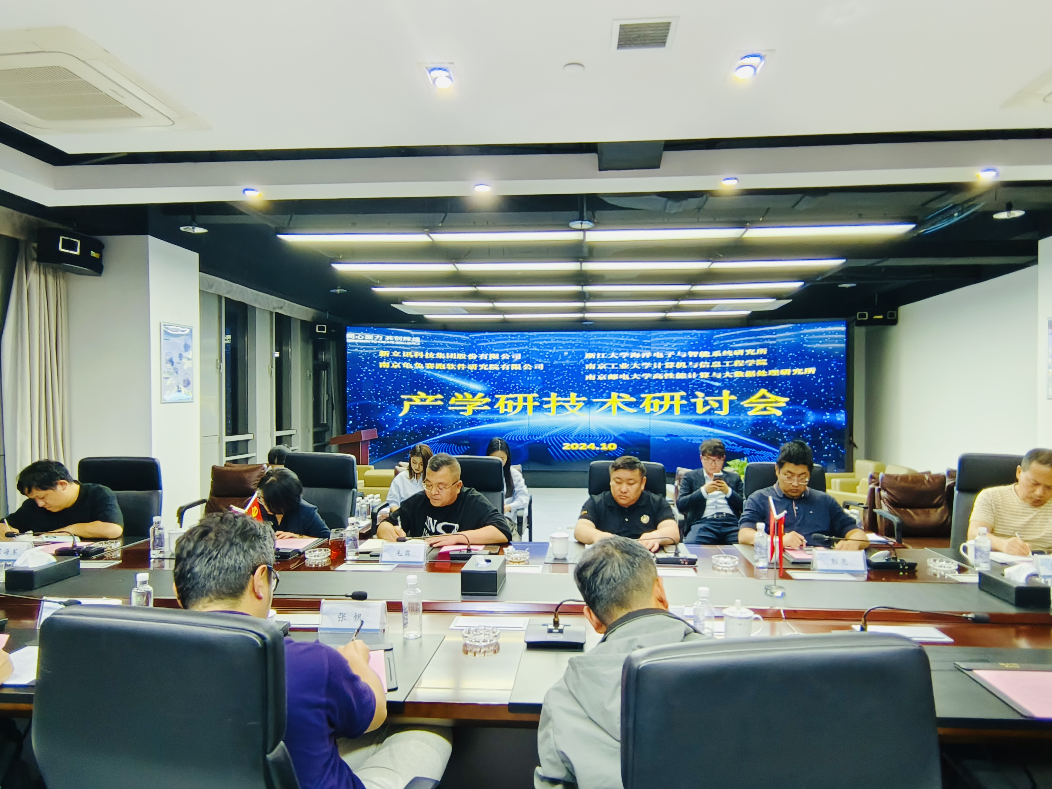 2024年10月10日,新立訊科技集團與浙江大學海洋學院、南京郵電大學高性能研究所、南京工業(yè)大學計算機學院在新立訊總部召開2024年度產(chǎn)學研技術研討會,浙江大學博士生導師張帆教授、南京郵電大學博士生導師季一木教授,劉尚東教授、南京工業(yè)大學計算機學院院長劉學軍教授,新立訊科技集團董事長毛霖,副總經(jīng)理李偉,財務總監(jiān)彭亮及研發(fā)中心(龜兔賽跑軟件研究院)主要負責人、技術骨干、業(yè)務骨干等代表出席會議。