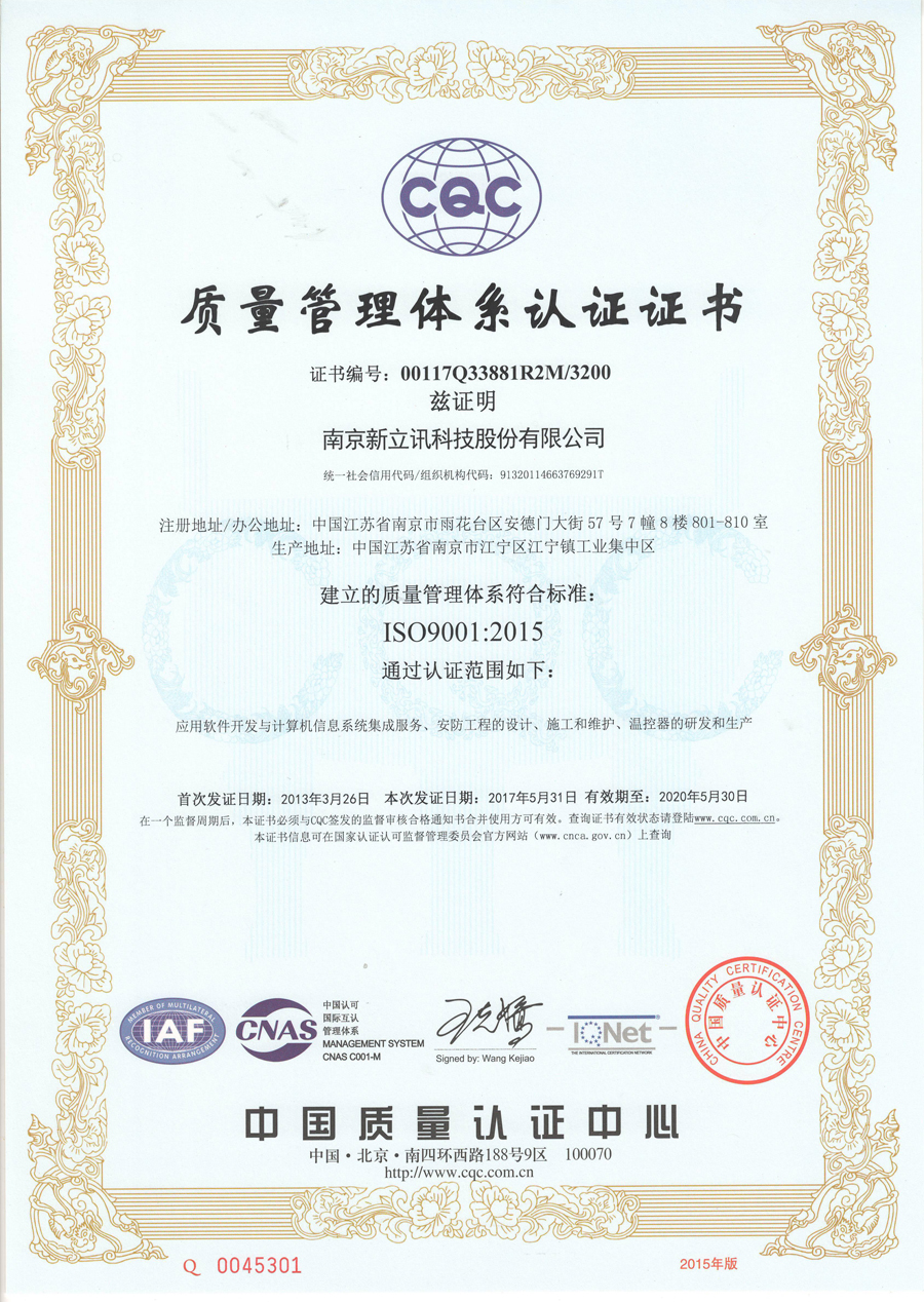 2017年5月,新立訊經(jīng)中國(guó)權(quán)威認(rèn)證機(jī)構(gòu)CQC(中國(guó)質(zhì)量認(rèn)證中心)全面、嚴(yán)格的評(píng)定與審核,正式通過(guò)ISO9001國(guó)際質(zhì)量管理體系認(rèn)證、ISO14001國(guó)際環(huán)境管理體系認(rèn)證、OHSAS18001職業(yè)健康安全管理體系認(rèn)證三大國(guó)際管理體系認(rèn)證,并獲得相關(guān)證書(shū)。證書(shū)涵蓋范圍包括軟件開(kāi)發(fā)與計(jì)算機(jī)信息系統(tǒng)集成服務(wù),安防工程的設(shè)計(jì)、施工和維護(hù),溫控器的研發(fā)和生產(chǎn)及相關(guān)管理活動(dòng)。這意味著新立訊成為CNAS(中國(guó)合格評(píng)定國(guó)家認(rèn)可委員會(huì))、IQNet(國(guó)際認(rèn)證聯(lián)盟)和IAF(國(guó)際認(rèn)可論壇)三方共同認(rèn)可的綜合數(shù)據(jù)應(yīng)用服務(wù)商,更標(biāo)志著新立訊的質(zhì)量管理、環(huán)境管理、健康安全管理等已達(dá)到國(guó)際先進(jìn)水平。同時(shí)此三項(xiàng)證書(shū)的取得是對(duì)新立訊企業(yè)管理理念和質(zhì)量管理水平的充分肯定,也為企業(yè)向社會(huì)提供優(yōu)質(zhì)的產(chǎn)品和服務(wù)提供了強(qiáng)有力的保障。