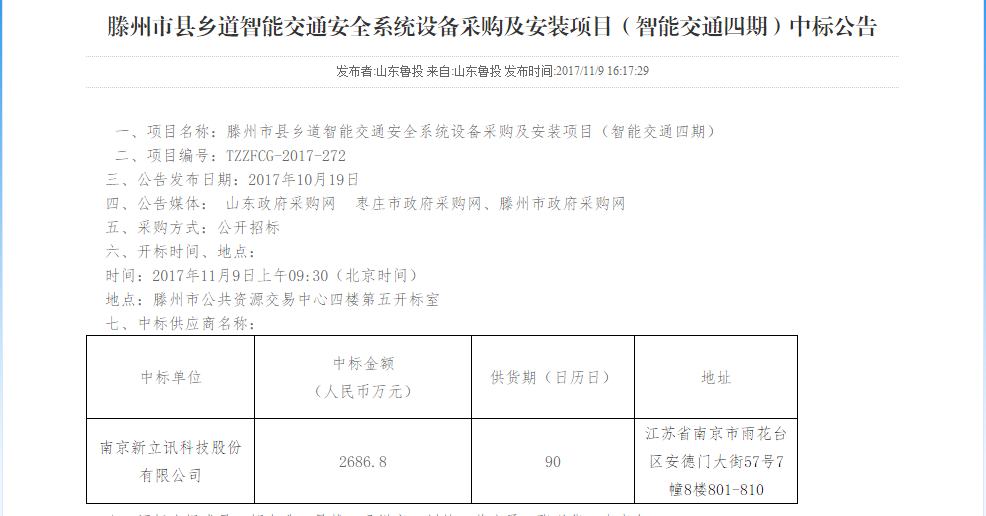2017年11月9日,經(jīng)山東滕州市公安局交通警察大隊公開招投標(biāo),新立訊山東辦事處以優(yōu)秀的技術(shù)解決方案、完善的售后服務(wù)體系等,贏得了評標(biāo)專家和招標(biāo)方的肯定,成功中標(biāo)山東滕州市縣鄉(xiāng)道智能交通安全系統(tǒng)設(shè)備采購及安裝項目(以下簡稱“滕州市智能交通四期項目”)(招標(biāo)項目編號:TZZFCG-2017-272),中標(biāo)金額為人民幣2686.8萬元。