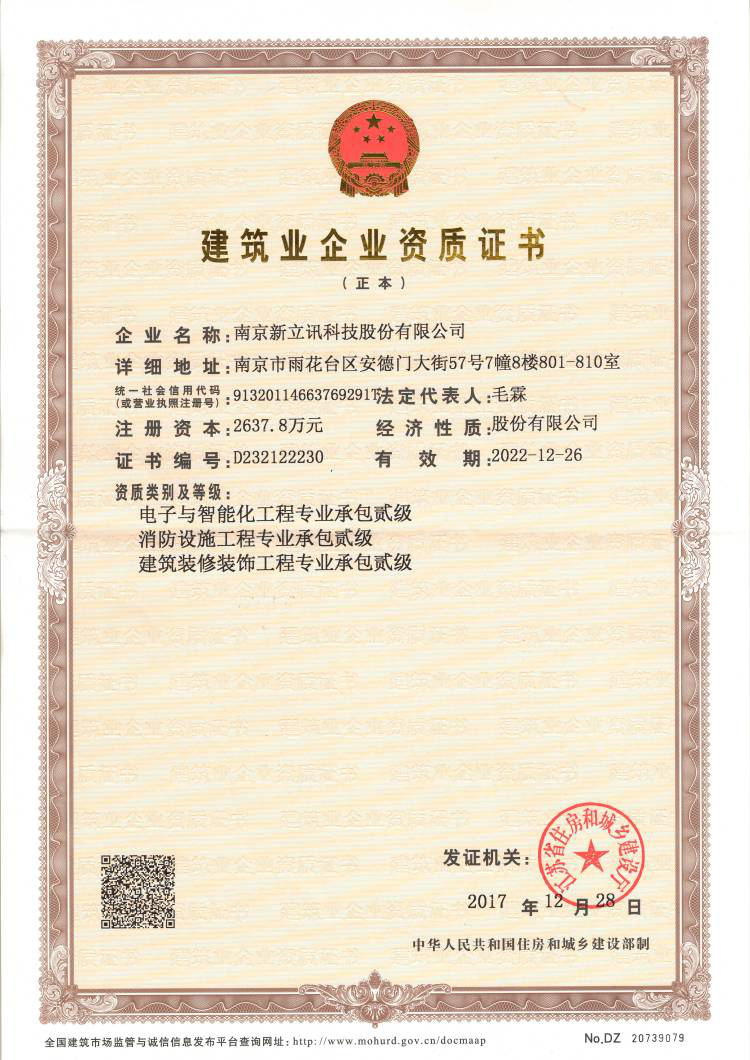 2017年12月,南京新立訊科技股份有限公司獲由江蘇省住房和城鄉(xiāng)建設(shè)廳頒發(fā)的《建筑業(yè)企業(yè)資質(zhì)證書》,包含“電子與智能化工程專業(yè)承包”、“消防設(shè)施工程專業(yè)承包”及“建筑裝修裝飾工程專業(yè)承包”三項(xiàng)資質(zhì),證書編號(hào):D232122230,證書有效期:2022年12月26日。