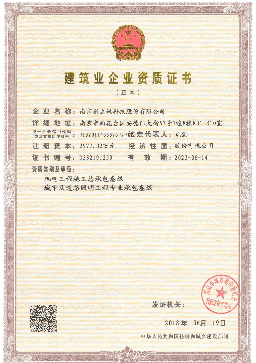 2018年6月19日,新立訊再獲南京市城鄉(xiāng)建設委員會頒發(fā)的機電工程施工總承包、城市及道路照明工程專業(yè)承包資質(zhì)證書。