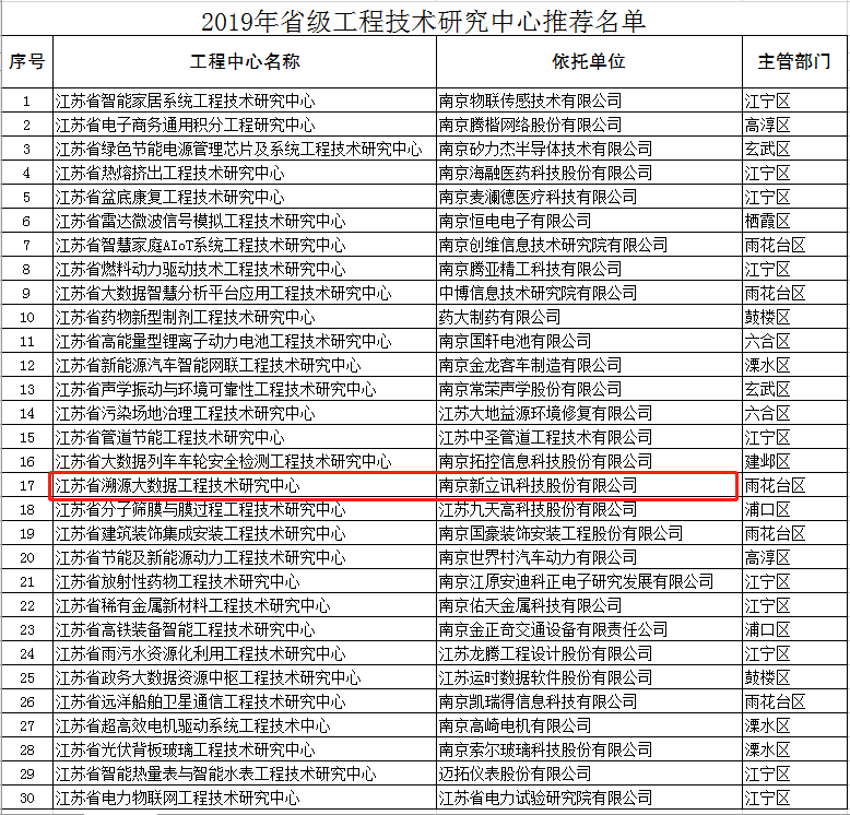 近期,經(jīng)江蘇省科技廳組織評(píng)審,南京市科學(xué)技術(shù)局官網(wǎng)公示了2019年度省級(jí)企業(yè)工程技術(shù)研究中心及企業(yè)院士工作站推薦名單,新立訊獲授江蘇省溯源大數(shù)據(jù)工程技術(shù)研究中心(省級(jí))。