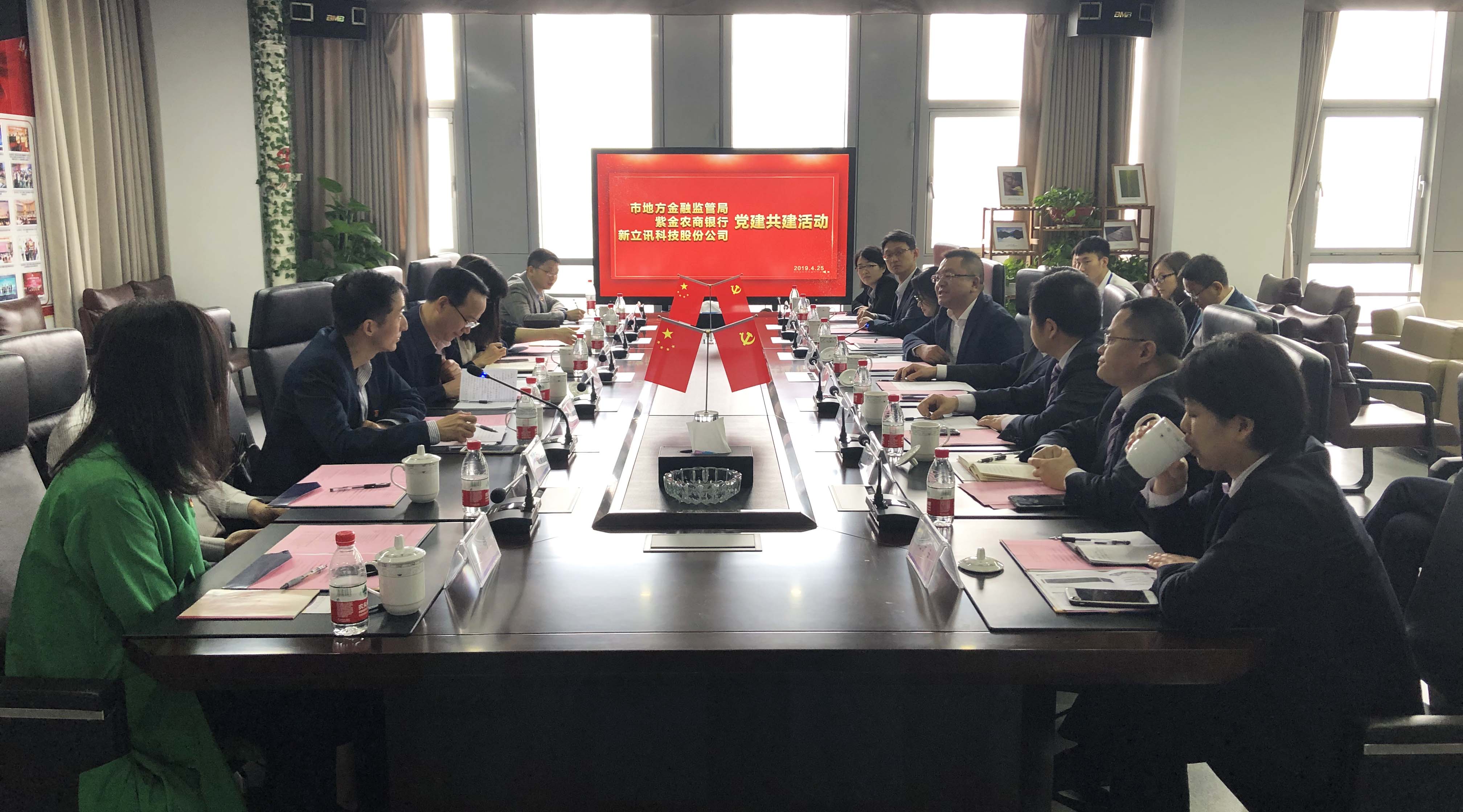 2019年4月25日,南京市地方金融監(jiān)管局、紫金農(nóng)商銀行與南京新立訊科技股份有限公司共同在新立訊總部開展黨建共建活動(dòng)。金融監(jiān)管局黨組書記、局長劉永彪,紫金農(nóng)商銀行黨委副書記王留平;中國(南京)軟件谷高新局局長吳瑩;新立訊董事長毛霖、公司高管層及各方黨員代表等共同參與此次黨建活動(dòng)。共建活動(dòng)由新立訊黨支部書記、副總經(jīng)理李偉主持。