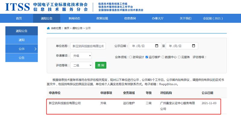 2021年11月初,經(jīng)中國(guó)電子工業(yè)標(biāo)準(zhǔn)化技術(shù)協(xié)會(huì)信息技術(shù)服務(wù)分會(huì)專(zhuān)業(yè)評(píng)審,新立訊順利通過(guò)ITSS信息技術(shù)服務(wù)運(yùn)行維護(hù)二級(jí)資質(zhì)認(rèn)證。