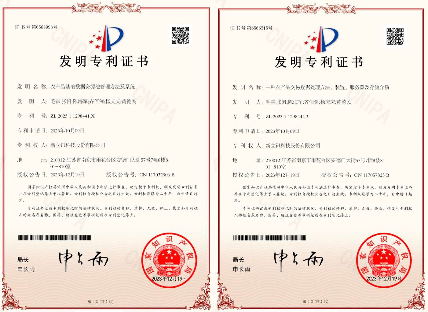 四項發(fā)明專利分別是:基于5G物聯網和數據監(jiān)測的農產品監(jiān)測方法及系統(tǒng)(CN116911723B),基于AI鑒真技術和溯源量化的農產防偽溯源方法及云平臺(CN116911883B),農產品基礎數據資源池管理方法及系統(tǒng)(CN117032906B),一種農產品交易數據處理方法、裝置、服務器及存儲介質(CN117057825B)。四項發(fā)明專利均為原始取得。